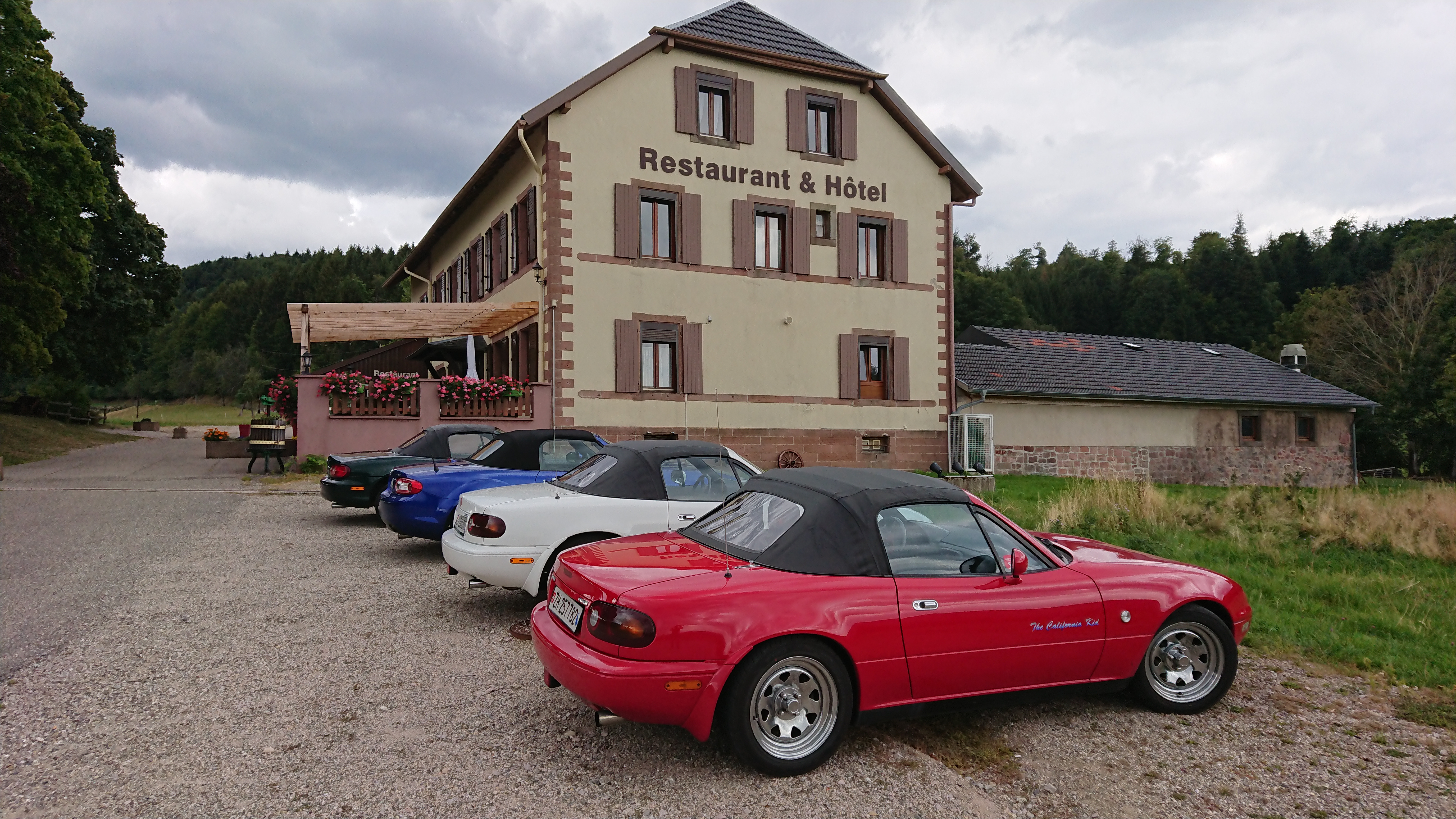 Da ich als Beifahrer die Kameraführung für den bereits fertiggestellten Film von Götti Urs übernahm, konnte er sich voll und ganz auf die anspruchsvollen Kurven konzentrieren. Die fahrerische Leistung wurde mit einem feinen Mittagessen in der Ferme-Auberge du Kohlschlag belohnt. Eine Ferme-Auberge ist ein Berggasthof mit eigener Landwirtschaft, manchmal auch mit Übernachtungsmöglichkeit. Dieser Gasthof bat uns einen herzlichen Empfang und die für die Vogesen typische Gastfreundschaft. Auf dem Teller kamen vorrangig Produkte vom Hof.